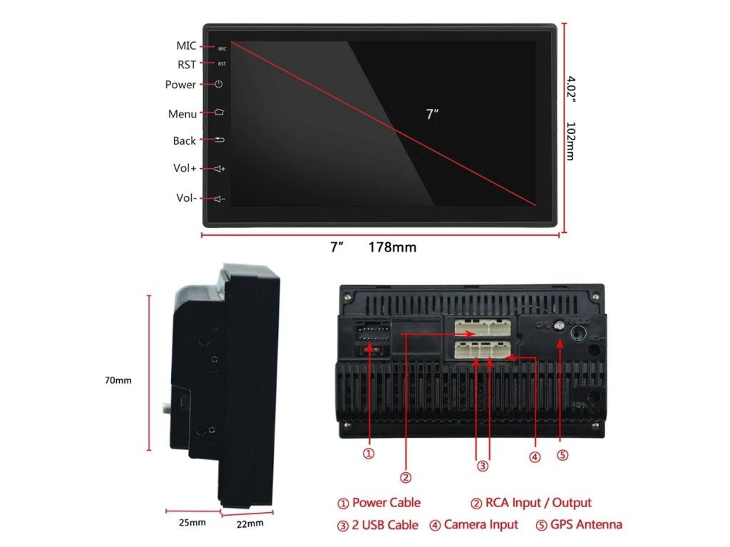 1.Tento multimediální přehrávač do auta je kompatibilní se všemi vozy. Zkontrolujte prosím instalační rozměr;