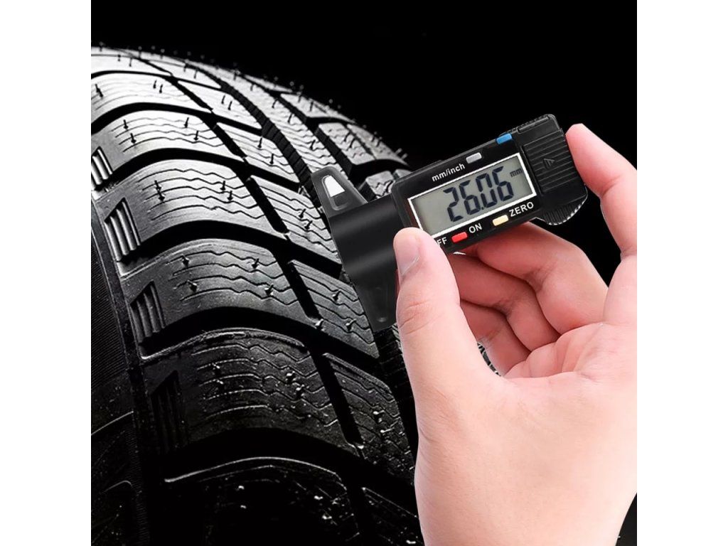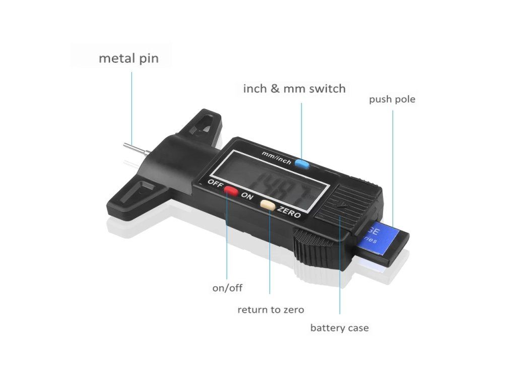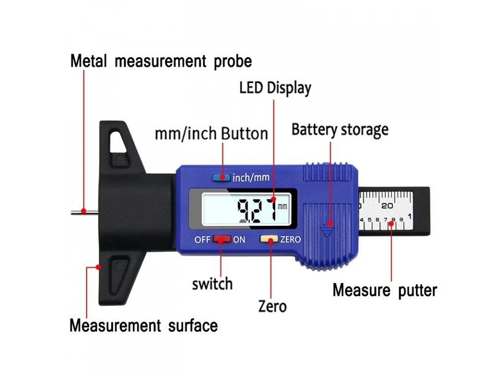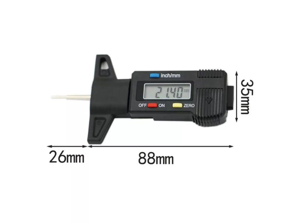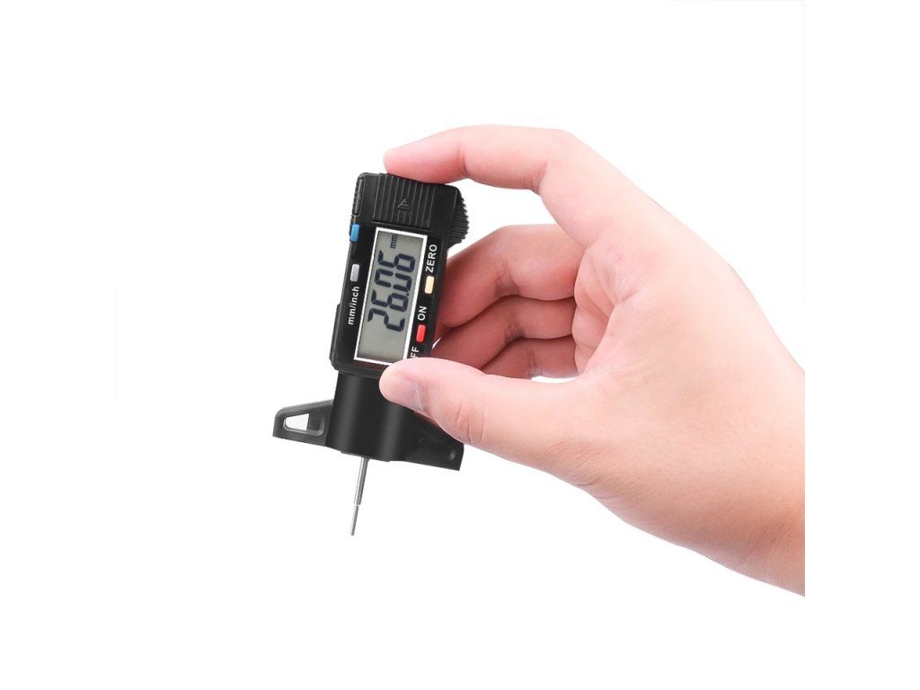 Digitální hloubkoměr pro měření hloubky dezénu pneumatiky. Je vhodný pro snadnou kontrolu hloubky profilu pneumatiky či brzdových destiček.