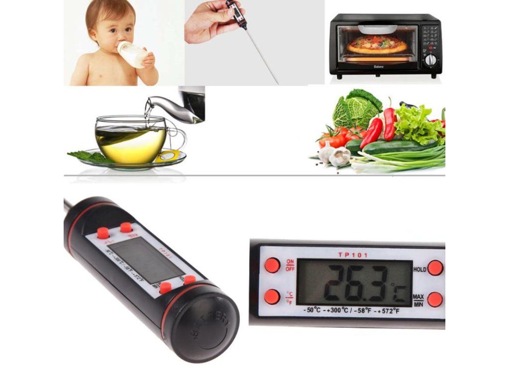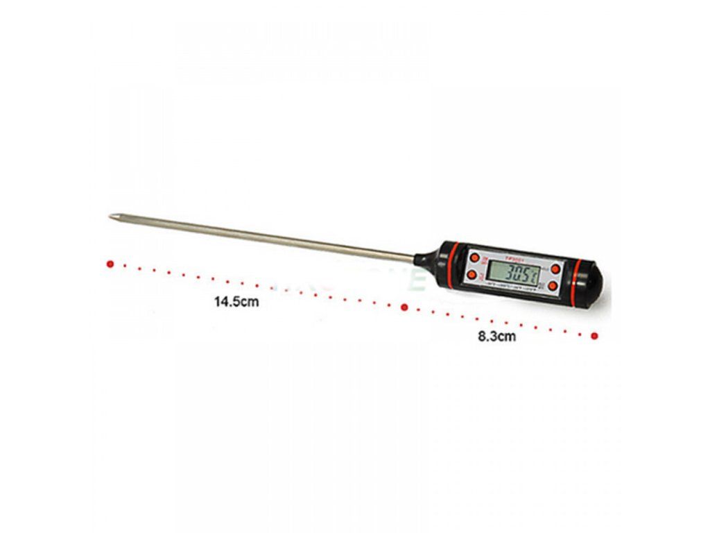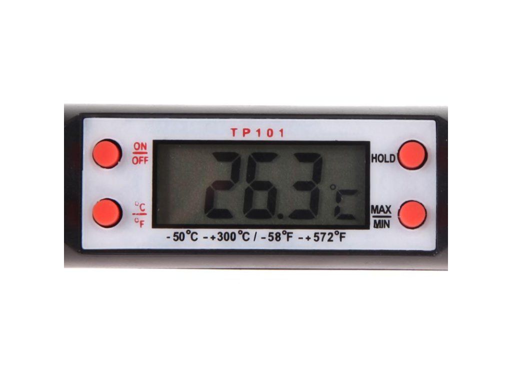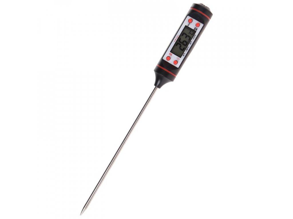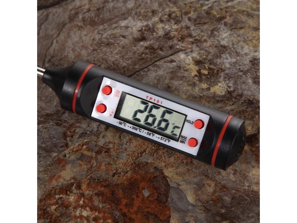 Digitální teploměr slouží k měření teploty uvnitř masa, omáček, nápojů apod. Rozsah měření je od -50°C do +300°C. Lze nastavit měření v °C nebo °F. Po 15 minutách se teploměr sám přepne do vypnutého režimu. LCD displej přehledně ukazuje údaje.
