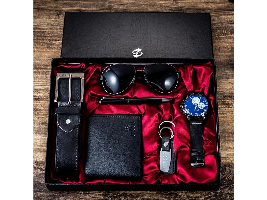 Sada obsahuje: Hodinky, peněženku, sluneční brýle, pásek, propisku, klíčenku.